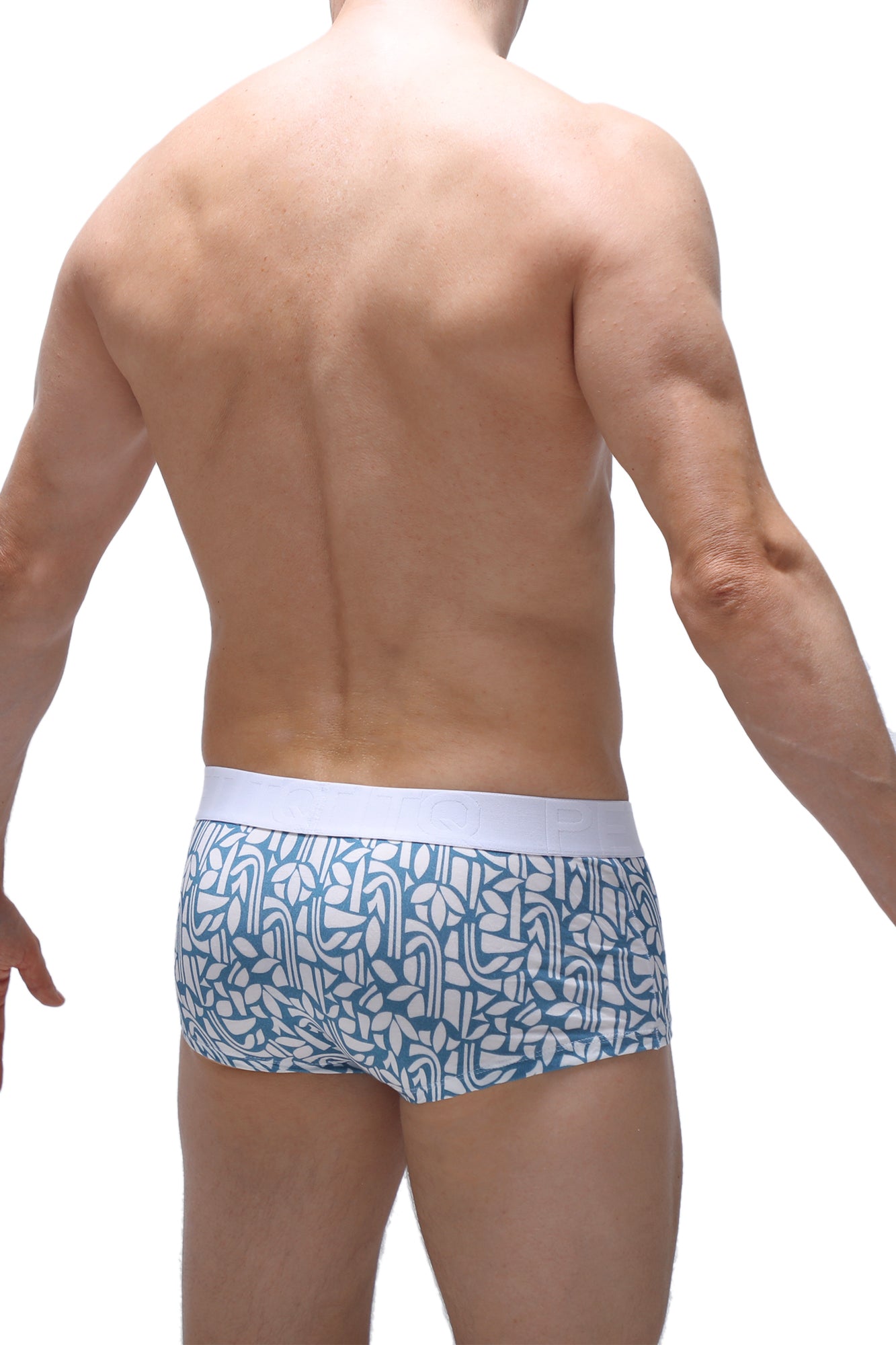 Blue modal boxers with a cute geometric pattern. White waistband. Contoured pouch