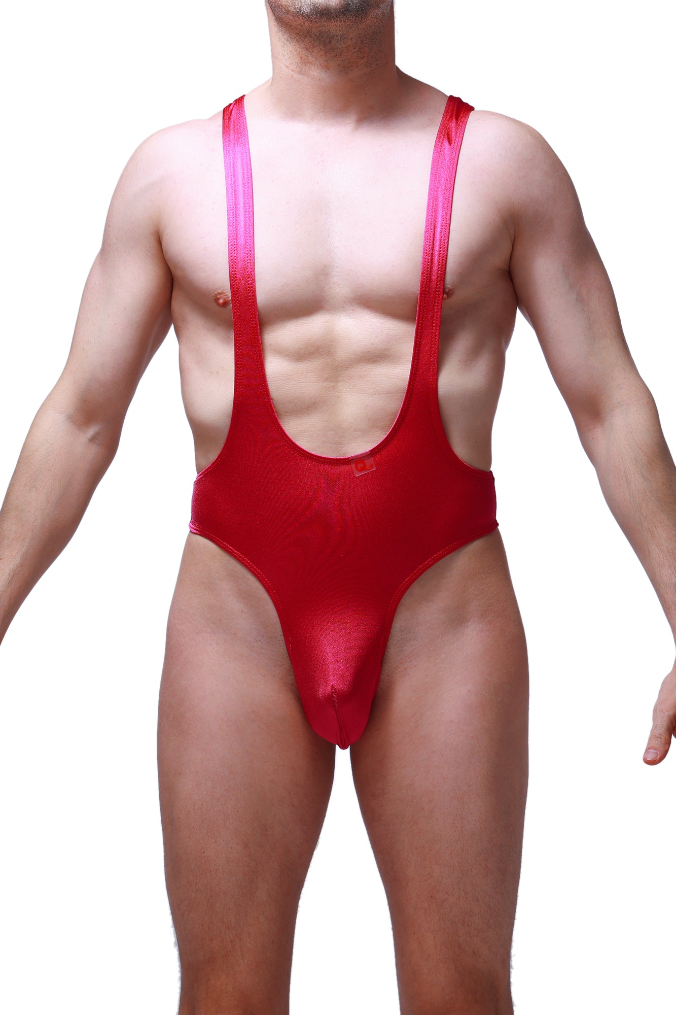 Fuchsia bodysuit with a thong shape in the back. Shows your chest in the front. Fuchsia nylon fabric like swimwear fabric.