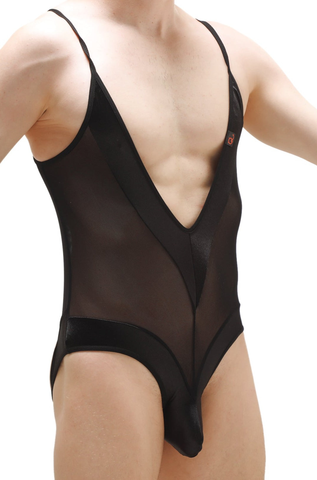 Erotic black bodysuit, open on the butt with just a string behind. Satin band and the rest is see-through. Very low on the chest and back